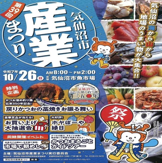 日別アーカイブ: 2025年10月7日 気仙沼産業まつり 第39回気仙沼市産業まつり開催されます。10月26日(日)会場は、気仙沼魚市場内8:00~14:00 今年も市場で【朝めし】【か... 2025年10月7日(火)テーマ:告知・イベント